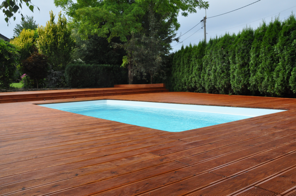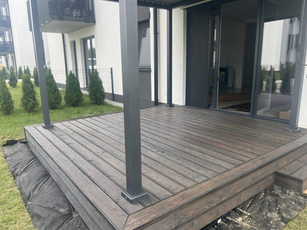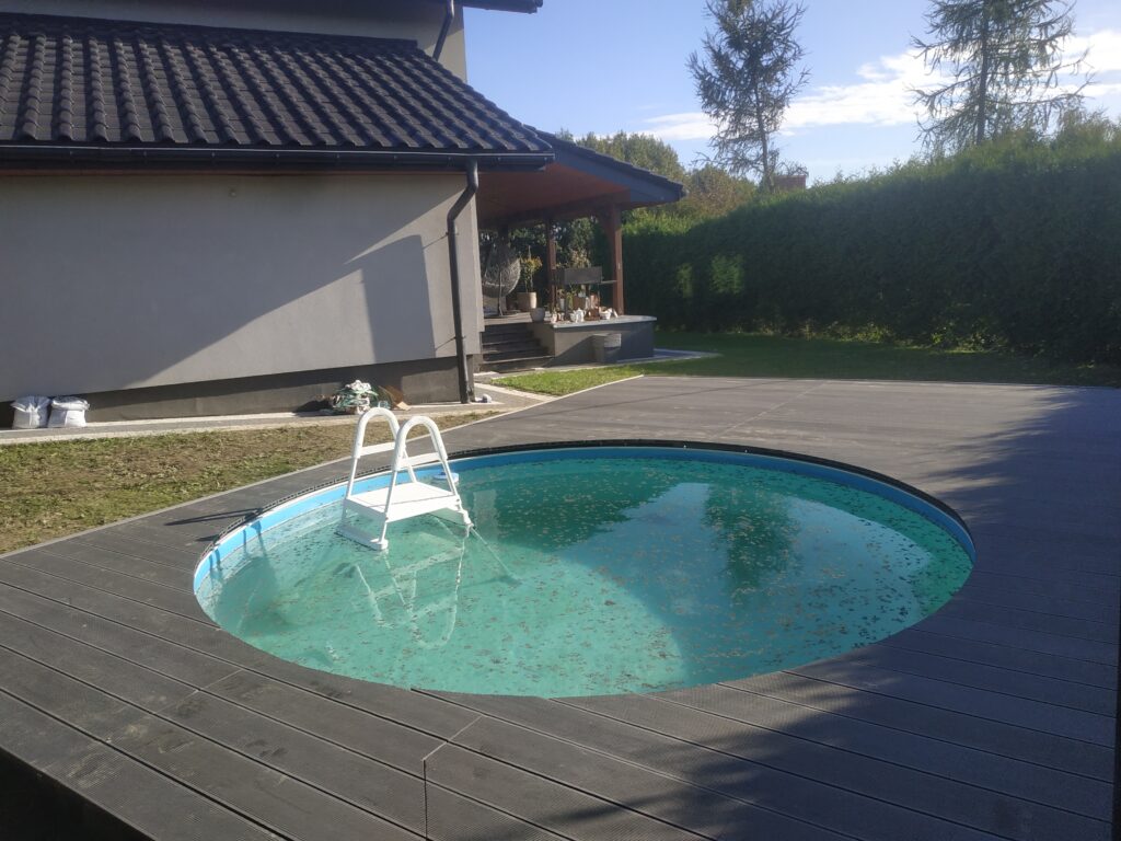 Budowa tarasu z basenem 150 m2, fundamenty z konstrukcją oraz potrzebnymi akcesoriami pod osprzęt basenu. Dwupoziomowy, deska – modrzew syberyjski. Kolor teak. Kształt – wielokąt.