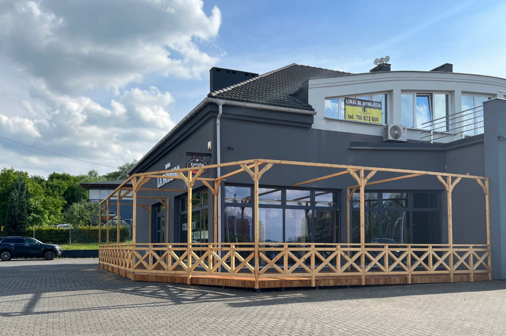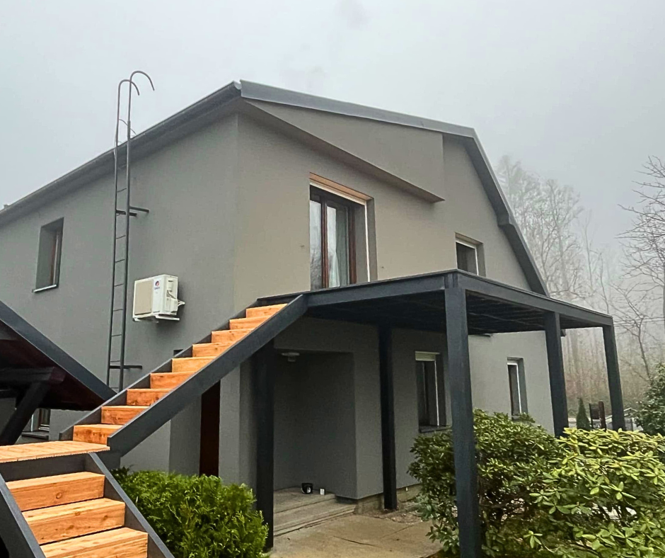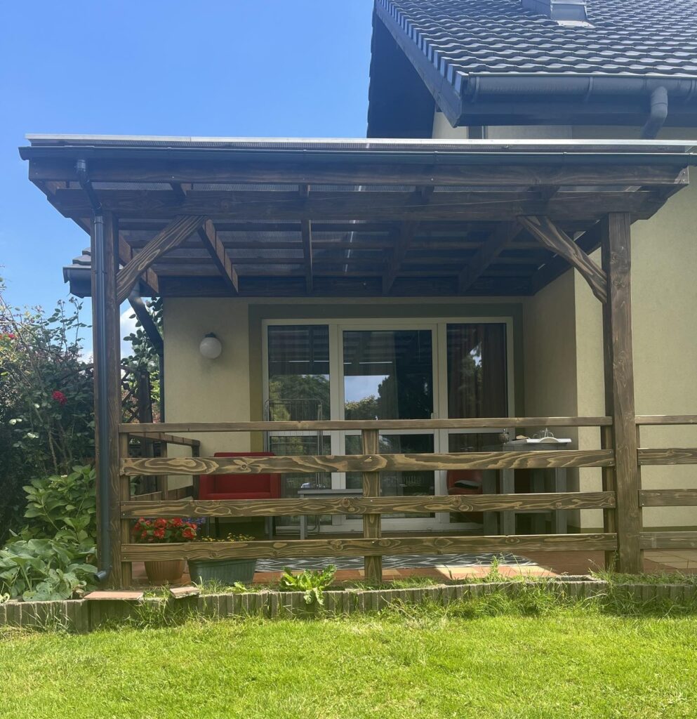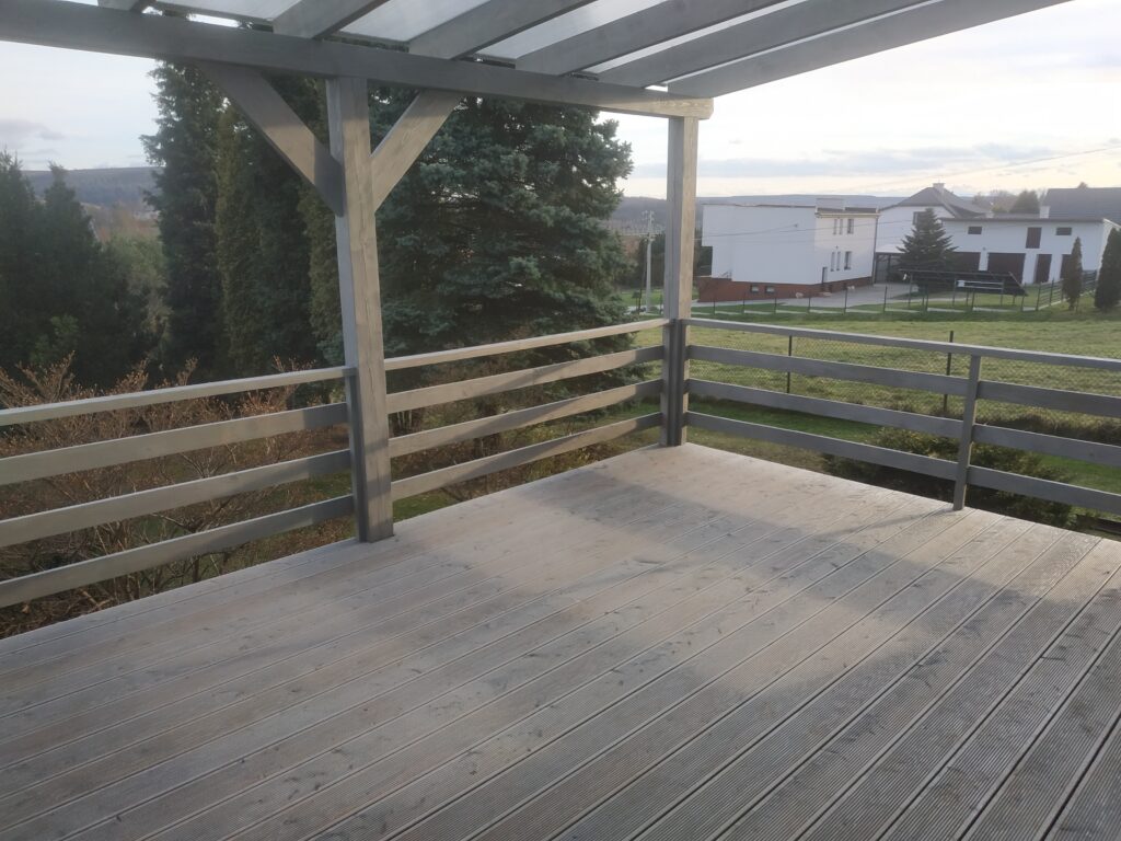 Budowa tarasu o pow.50m2 wraz z zadaszeniem oraz żaluzjami i ozdobnymi zastrzałami. Farba Remmers biel mocno kryjąca, akrylowa . Zadaszenie wykonane z blachy na rąbek z powłoką poliuretanową.