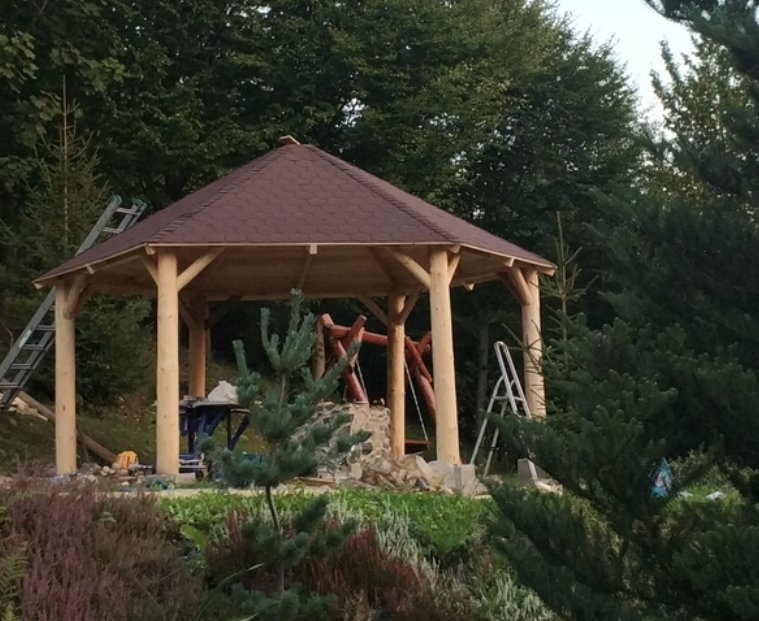 Altana sześciokątna z bala, pokryta gontem bitumicznym.