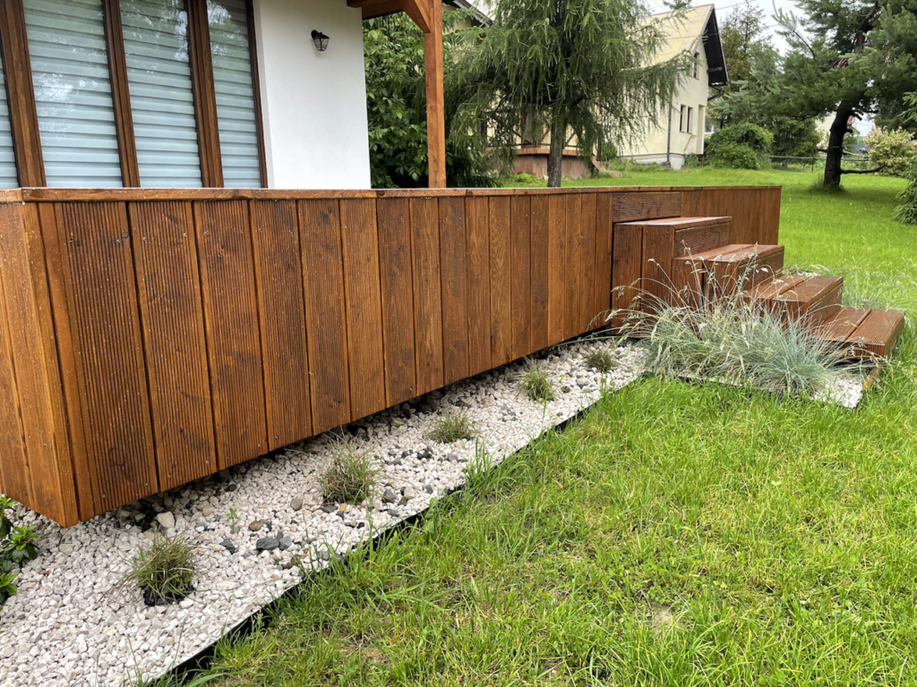 Budowa tarasu o pow. 50m2 wraz z konstrukcją pod późniejsze zadaszenie, razem z ozdobnymi zastrzałami i krzyżową balustradą. Dodatkowo dobudowa podwójnego zejścia z półpiętrem. Standardowe okucie legarów konstrukcyjnych blachą. Farba Remmers Orzech .