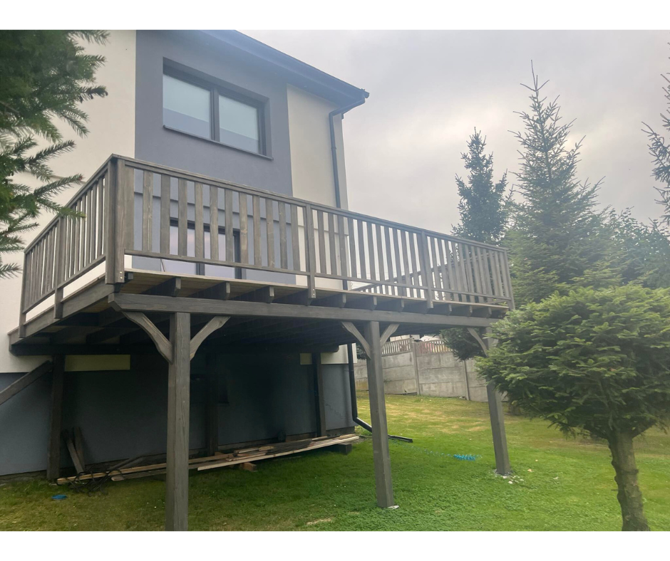 Budowa konstrukcji tarasu dla balkonu na piętrze ze schodami prowadzącymi do ogrodu, z deski modrzewiowej. Konstrukcja przygotowana pod montaż stalowej balustrady.